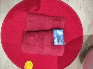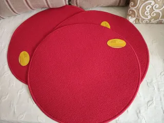 Set de tres alfombras redondas y dos toallas TODO SIN ESTRENAR. Un conjunto precioso para el baño o para cualquier rincón, pasillo, cuarto infantil..... - Alfombras de tela en color rojo. - Toallas de tela.