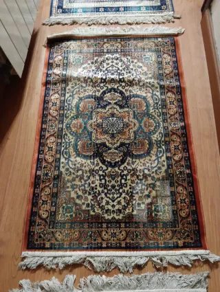 - Diseño de estilo oriental. - Patrones intrincados con borde decorativo con flecos. - Pelo corto y todas miden 68x1,05m. - El precio es por unidad. - Habría que peinarle los flecos y estirarlas ya que están de estar guardadas.