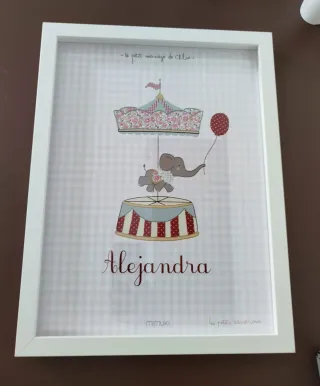 Set 2 Láminas Infantiles MIMUKI Enmarcadas (32x42 cm) Vendo conjunto de dos láminas decorativas de la firma Mimuki, ideales para habitación infantil o de bebé. Están en perfecto estado e incluyen los marcos blancos de alta calidad. Diseño: Estilo dulce y vintage. Una lámina con ilustración de elefante en carrusel (personalizada con el nombre "Alejandra") y otra con la inicial "A" sobre fondo de rayas. Medidas: 32 x 42 cm cada una (con marco incluido). Estado: Impecables, sin utilizar y listas para colgar. Precio original: 80 € el conjunto. Es una oportunidad excelente para hacerte con decoración