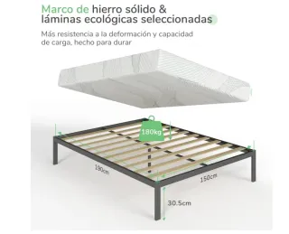 Somier de hierro sólido con láminas ecológicas seleccionadas, diseñado para mayor resistencia y durabilidad. - Medidas: 150 cm de ancho x 190 cm de largo. - Altura del somier: 30.5 cm. - Capacidad de carga: 180 kg.