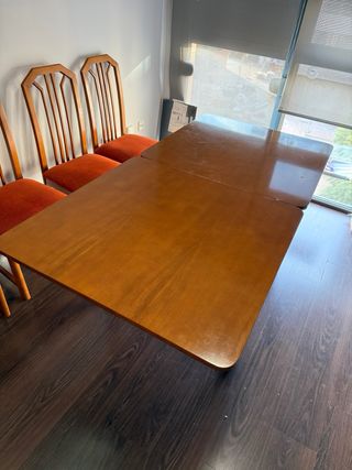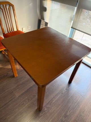Mesa de comedor de color cerezo de madera maciza. Cerrada 90x90cm Abierta 180x90cm Tiene marcas de uso. SE REGALAN LAS 4 SILLAS.