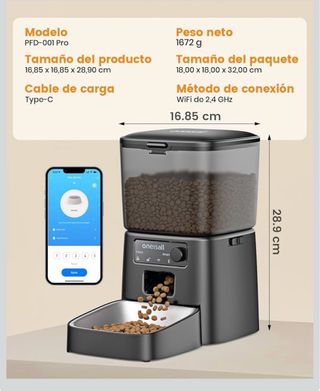 Comedero automático para mascotas de la marca Oneisall. Ideal para mantener a tu mascota alimentada. - Dispensador de comida. - Tazón de acero inoxidable. - Tapa superior para el almacenamiento de pienso. - 3.5L de almacenamiento. - Posibilidad de batería aunque no está incluida, lleva el cable de carga. - La batería dura 60 días. - 2,4G Wifi APP Control. - Contiene bolsa de desecante.