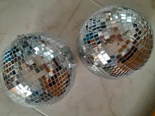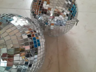 Dos bolas de discoteca con un diseño clásico de los años 80. - Cubiertas con pequeños espejos. - Ideales para crear ambiente festivo. Regalazo.