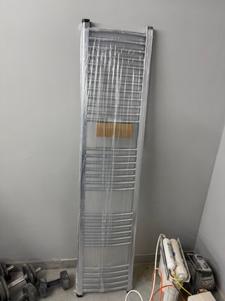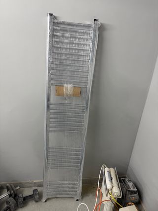 Toallero eléctrico para baño, ideal para mantener tus toallas calientes y secas. - Diseño moderno y funcional. - Acabado plateado brillante. - Fabricado en metal resistente.