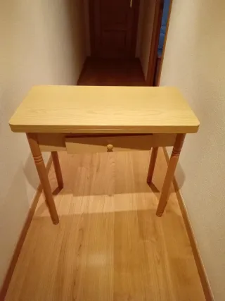 Mesa auxiliar de madera con un diseño clásico y funcional. Cuenta con un práctico cajón para almacenamiento. - Patas torneadas. - Tirador de pomo. - Extensible. *SOLO VENTA EN PERSONA*