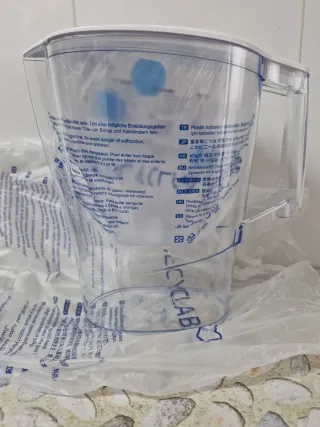 Jarra para filtrar agua de la marca Brita. Incluye varios filtros. - Diseño transparente con detalles en azul. - Fabricada en plástico resistente.