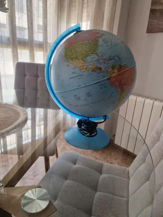 Original lámpara con forma de globo terráqueo, ideal para decorar cualquier espacio. - Diseño educativo y decorativo. - Base y soporte en color azul.