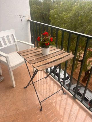 Vendo mesa de exterior modelo TÄRNÖ de IKEA. Es de madera maciza y acero negro, muy resistente y perfecta para balcones pequeños porque se pliega totalmente. Está en muy buen estado. • Medidas: 55x54 cm.