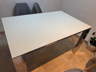 Elegante mesa de comedor extensible con un diseño moderno. - Superficie de cristal. - Patas de acero pulido. - Acabado plateado y blanco.
