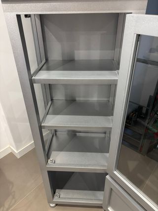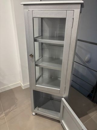 Elegante vitrina de baño con un acabado plateado brillante. Ideal para almacenar tus artículos de tocador y mantener tu baño organizado. - Fabricada con madera maciza. - Puerta frontal con panel de cristal. - Estantes interiores para almacenamiento.