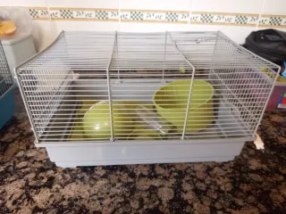 Jaula espaciosa para hámster con accesorios. - Base de plástico gris. - Rejilla metálica plateada. Lleva para poner el agua, la comida, rampa, rueda