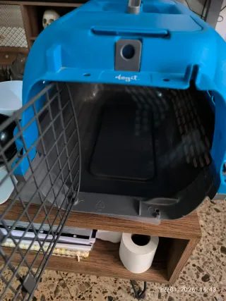 Transportín para gatos o perros pequeños ,ideal para viajes o visitas al veterinario, marca dogit.Su diseño permite una buena ventilación. Con una pequeña rajita. Comederos cómo nuevos - Color azul y gris.