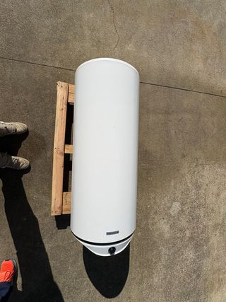 Termo eléctrico Thermor de 150 litros. Se vende por que se ha montado uno con mas capacidad. - Modelo VM 150. - Color blanco. - Referencia: 271102 - Potencia 1800w - Peso 41Kg - Tiempo de calentamiento 5h 16 min - Tomas 3/4 Medidas: Longitud 122cm Diametro 50,5cm Fondo 52cm Distancia anclaje 44cm Distancia entre anclajes superiores e inferiores 80cm PVP 925 + IVA
