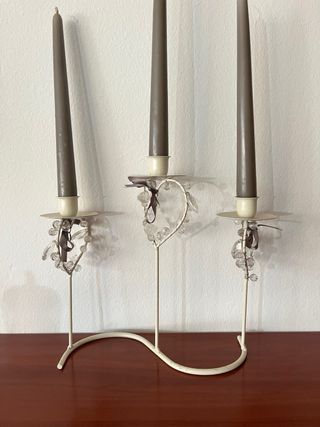 Elegante candelabro con un diseño moderno y delicado. Perfecto para añadir un toque de estilo a cualquier espacio. - Base metálica con acabado en color crema. - Tres soportes para velas cónicas. - Adornos de cristal y cuentas transparentes.