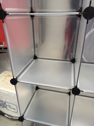 Práctica estantería modular para organizar tus pertenencias. Su diseño transparente y blanco se adapta a cualquier espacio. - Fabricada en plástico resistente. - Fácil montaje y desmontaje. - Múltiples compartimentos para almacenamiento.