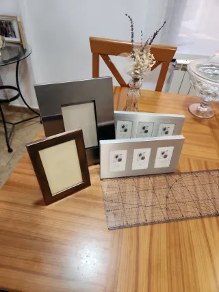 Conjunto de cuatro marcos de fotos de diferentes estilos y materiales. - Marco grande plateado. - Marco marrón con detalles metálicos. - Dos marcos plateados para tres fotos cada uno.