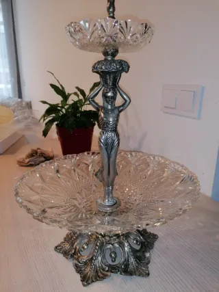 Elegante frutero de dos pisos con base y soporte central de metal plateado y cuencos de cristal tallado. - Diseño con figura central. - Dos niveles para presentar frutas o dulces. - Base ornamentada.