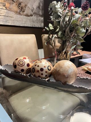 Conjunto de tres bolas decorativas con un diseño único. - Base metálica con acabado envejecido. - Bolas con motivos circulares en tonos beige y dorado. - Cada bola tiene un patrón diferente.