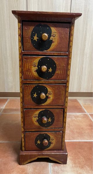 Pequeña cajonera de madera con cinco cajones. - Diseño pintado a mano con lunas y estrellas. - Tiradores de madera. - Ideal para organizar pequeños objetos.
