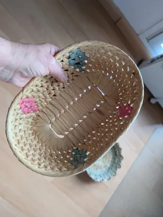 Conjunto de tres cestas de mimbre, cada una con un diseño único. 3 euros las 3 cestas. - Cesta ovalada con estampado de verduras y un detalle central. - Cesta redonda con borde decorativo. - Cesta ovalada con pequeños detalles florales en rosa y azul.