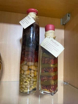 Set de dos botellas decorativas de la marca Pórtico, ideales para añadir un toque de estilo a tu cocina o interiorismo. - Uso exclusivamente decorativo.