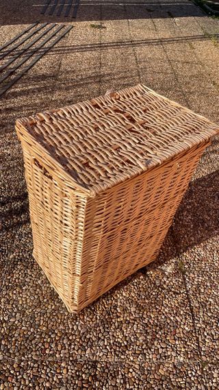 Cesto de mimbre, ideal para la ropa sucia, medidas 45 × 33 × 59. Pequeños desperfectos en la tapa y en la base visibles en las fotos