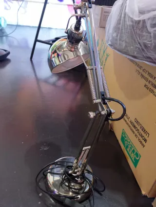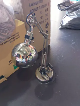 Lámpara de escritorio con un diseño moderno y funcional. - Brazo articulado para ajustar la posición. - Base redonda y estable. - Acabado metálico brillante.