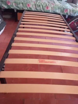 Se vende somier de 150x190 cm con patas incluidas. Como regalo, se incluye un colchón. - Estructura de metal resistente. - Láminas de madera. - Patas desmontables.