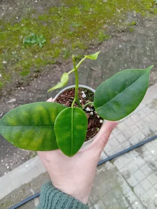 Planta de Hoya Mariae en maceta. - Hojas verdes con posibles variaciones de color. - Tallo joven con hojas nuevas. - Cultivo en maceta de plástico.