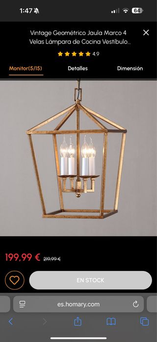 Elegante lámpara colgante con un diseño geométrico y acabado dorado. La vendo porque no combina con mi salón. - Estilo vintage. - Marco metálico. - Detalles de cristal. - bombillas de vela