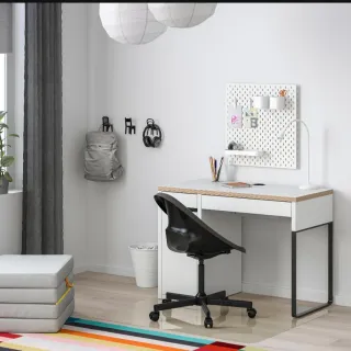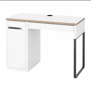 Escritorio con un diseño moderno y funcional. - Combinación de colores blanco y negro. - Estructura metálica. - Superficie de madera. Tiene unos pequeños rayones.