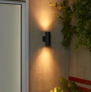 Aplique de pared vertical para exteriores, diseño moderno y elegante. - Altura de 16 cm. - Acabado en color negro. - En su caja. No se ha colocado. Sin estrenar. - La venta incluye 2 bombillas en su caja compatibles con el aplique (Bombilla LED GU10).