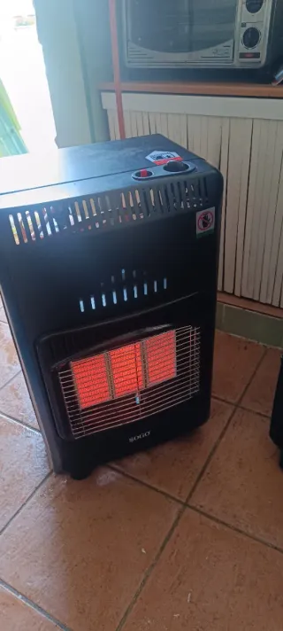 Estufa de gas SOGO en color negro. Ideal para calentar espacios. - Fabricada en metal y plástico. - Diseño moderno y funcional.