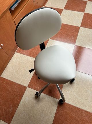 Silla tipo Pony con un diseño moderno y funcional. - Asiento y respaldo tapizados en material sintético blanco. - Base y ruedas de metal plateado.