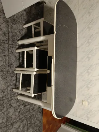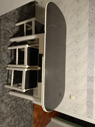 Conjunto de mesa de cocina con cinco banquetas. - Mesa con superficie de color negro y estructura blanca. - Banquetas con asientos negros y patas blancas. Tiene dos alas que se abren. Medidas : Cerrada 119 de largo por 70 de ancho. Abierta 179 de largo por 70 de ancho. Se pueden abrir una o dos alas, cada ala son 30 cm. 50 euros. Se puede comprar en conjunto con muebles de cocina y electrodomésticos o por separado. (Ver mi perfil).