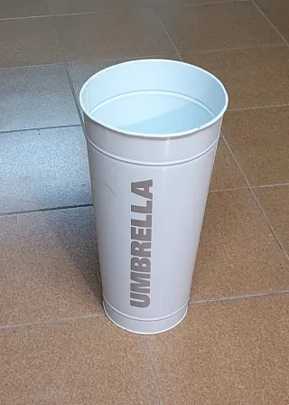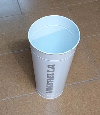 Paragüero de metal con un diseño clásico y elegante. Ideal para colocar en la entrada de casa o en la oficina. - Material: Metal - Color: Blanco - Inscripción: UMBRELLA