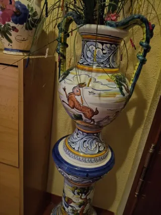 Conjunto de jarrón y pie de cerámica antigua, estilo Talavera con paraguero a juego. Piezas decorativas con un diseño muy elaborado y colorido. No se envía por ser material muy delicado. - Jarrón con asa y escena pintada. - Base o pie con motivos ornamentales. - Cerámica artesanal. - Firmado.