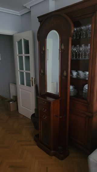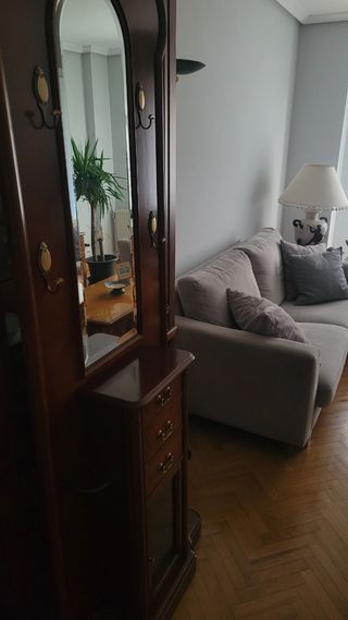 Elegante mueble del año 2001, recibidor para la entrada, de buena madera, con espejo, tres cajones, paragüero y puertecita con cristal y con enganches tipo perchero. A muy buen precio. Está regalado.