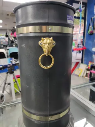 Elegante paragüero con un diseño distintivo. - Acabado en negro con detalles dorados. - Adornado con un tirador en forma de cabeza de león.