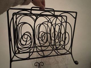 Conjunto versátil de forja negra que combina un biombo, un paragüero y un revistero. - Diseño elegante con detalles circulares en la parte superior. - Estructura de metal resistente.