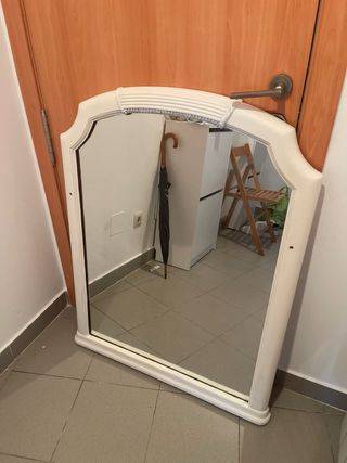 Elegante espejo con un diseño vintage que aportará un toque especial a tu hogar. Su marco combina la calidez de la madera con la claridad del cristal. Es de madera y pintado de blanco. - Marco con detalles decorativos. - Forma arqueada superior.