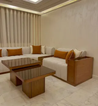 Conjunto de sofás, ideal para salones amplios. Su diseño moderno y elegante aporta calidez al espacio. - Tapicería de tela en tono personalizado - Detalles en madera. - Mesas auxiliares con superficie de cristal. Todo a medida y personalizado