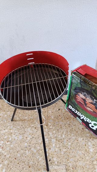 Barbacoa de carbón con un diseño clásico y funcional. Perfecta para disfrutar de tus parrilladas al aire libre. - Tapa roja con asa negra. - Cuerpo principal negro. - Soporte metálico plegable.