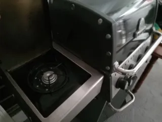 Barbacoa a gas Natecal con poco uso. Ideal para disfrutar de tus comidas al aire libre. - Doble parrilla. - Termómetros integrados. - Ruedas para fácil transporte.