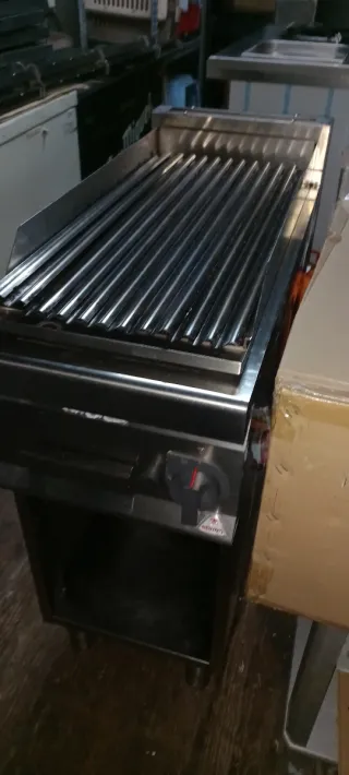 Parrilla de gas profesional con piedras volcánicas. 60cm x 50cm Cuesta un poco de encender y a trabajado mucho, pero funciona correcto - Superficie de cocción amplia. - Mandos de control individuales. - Construcción robusta en acero inoxidable.