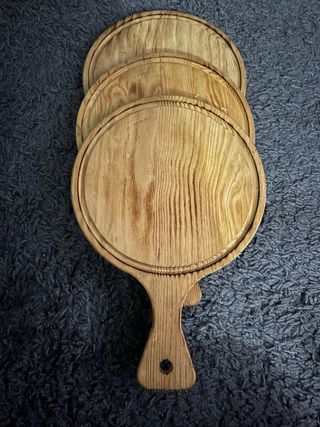 Conjunto de 3 tablas de madera, 24cm de diámetro, ideales para cocina, parrilla o uso en hostelería. Presentan un diseño rústico y funcional. - Fabricadas en madera. - Color marrón natural. - Borde decorativo. - Asa con orificio para colgar.