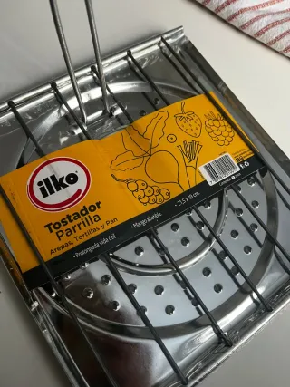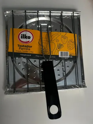Tostador parrilla de la marca Ilko, ideal para preparar arepas, tortillas y pan. - Mango abatible. - Medidas: 21,5 x 19 cm. - Prolongada vida útil.