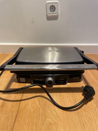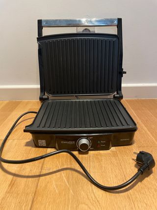 Parrilla eléctrica con control de temperatura. - Superficie de cocción antiadherente. - Asa extraíble para facilitar la limpieza. - Bandeja recogegrasas.