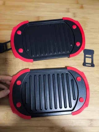 Parrilla Lekue con un diseño moderno y funcional. - Exterior en silicona roja. - Superficie de cocción negra.