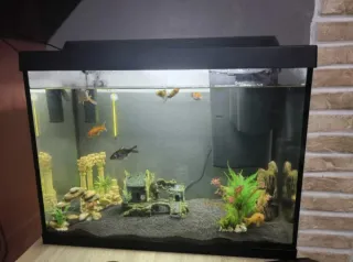 Acuario de gran tamaño, 100 litros ideal para mantener peces y plantas acuáticas. Con calentador termómetro plantas artificiales el filtro se a averiado por eso la vendo . La vendo según está todavía quedan dos peces . podría cambiar por voladero para pájaros